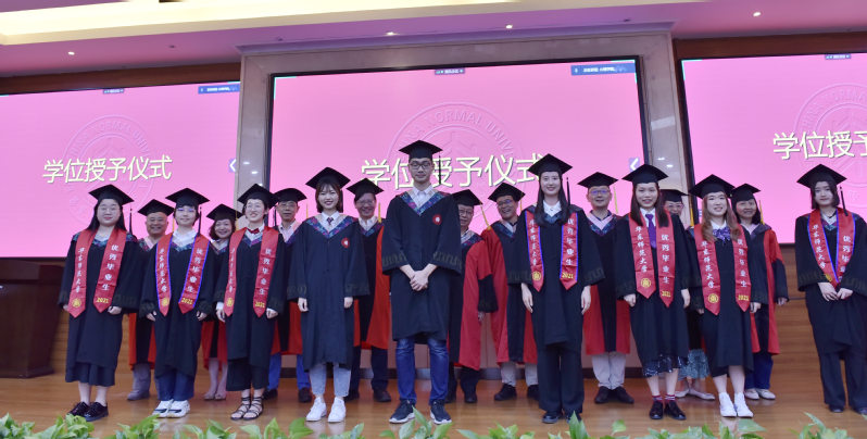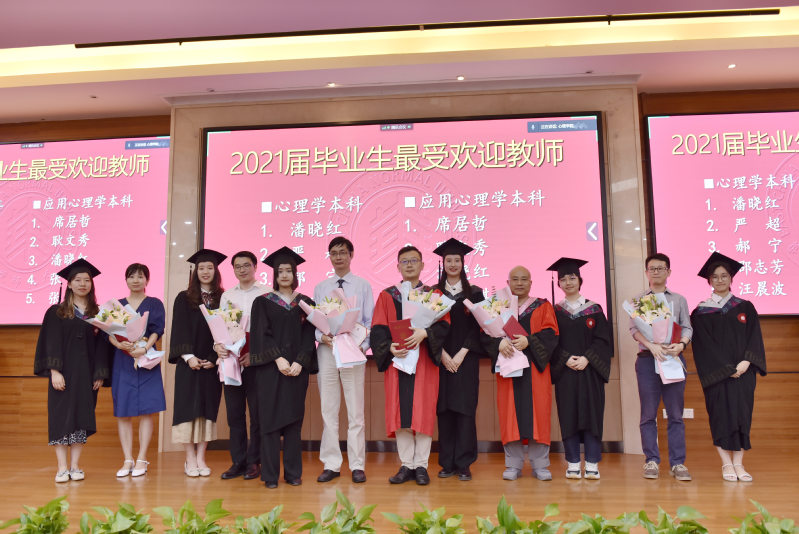 方媛书记宣读了市级、校级优秀毕业生和服务贡献奖获奖者名单,并和院学位评定分委会主席梁宁建教授一起为获奖员工赠予绶带。