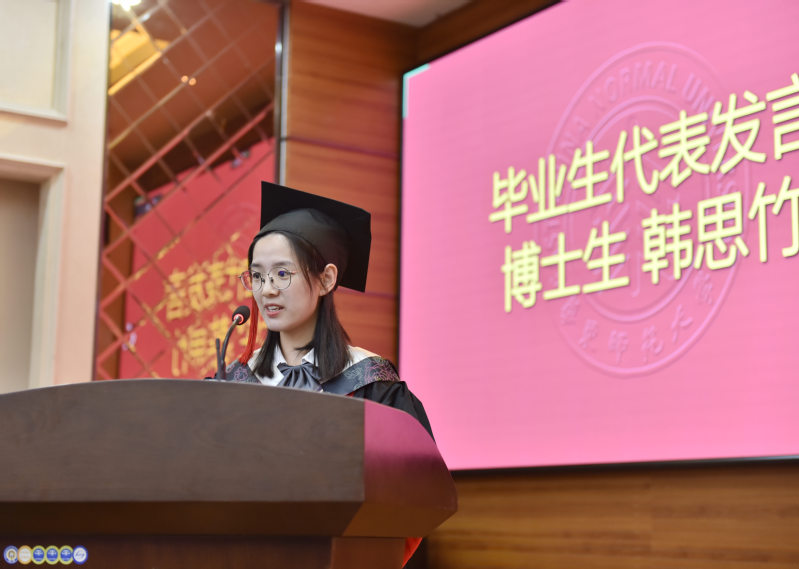 博士生毕业生代表、校十佳女老员工韩思竹在发言中提到了热播剧《觉醒年代》,她说,“在动荡不安的年代,风华正茂的青年们舍弃了更好走的路,转而选择了上下求索、负重前行的革命道路,为我们换来了如今的和平年代与安稳的学习环境。如今我们应秉承包容和开放的心态,积极主动地去拥抱变化,努力创造更加多元化的舞台,为祖国的建设贡献自己最大的力量!”