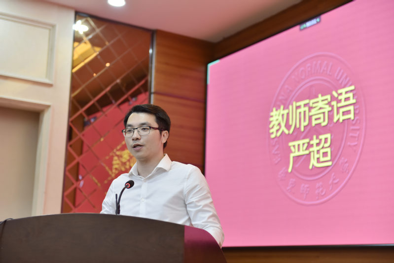 校优秀党员获得者、最受毕业生欢迎教师严超在发言中,祝贺同学们顺利毕业,并为毕业生们送上祝福:祝愿毕业生们带着“决心、信心、恒心,创意和乐意”这“三心二意” 迈向人生一个又一个巅峰。