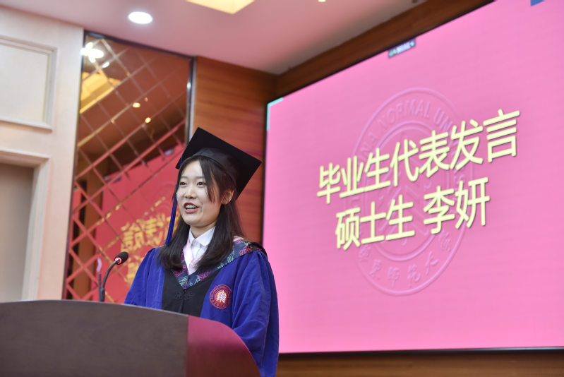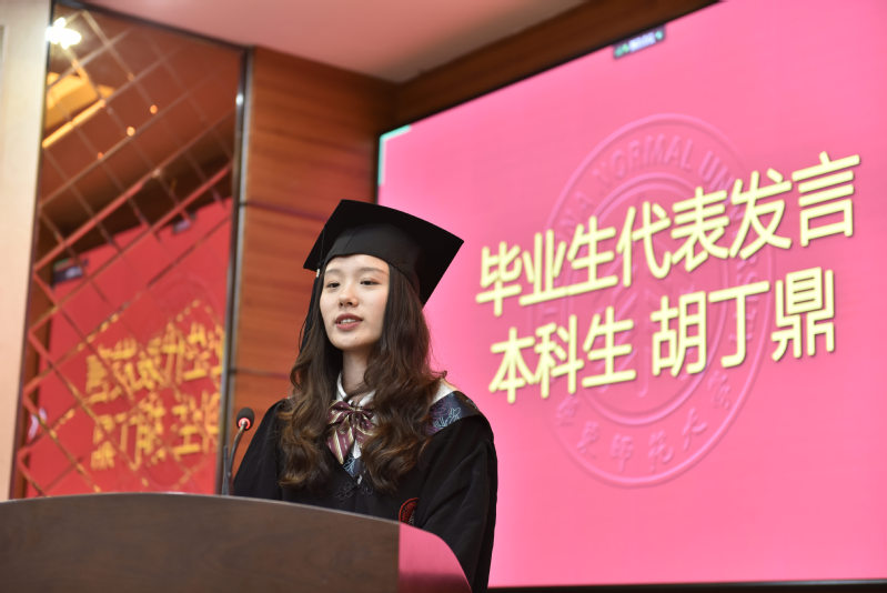 本科生毕业生代表、上海市优秀毕业生胡丁鼎在发言中谈到,面对人生中的未知和不确定,要有“冲了再说”的勇气——当机会降临,先抓住,再努力做好。她还提到,永远不会忘记心理学在心中种下的种子,那是对人的关怀,对科学的追求,以及对这个世界的热爱。