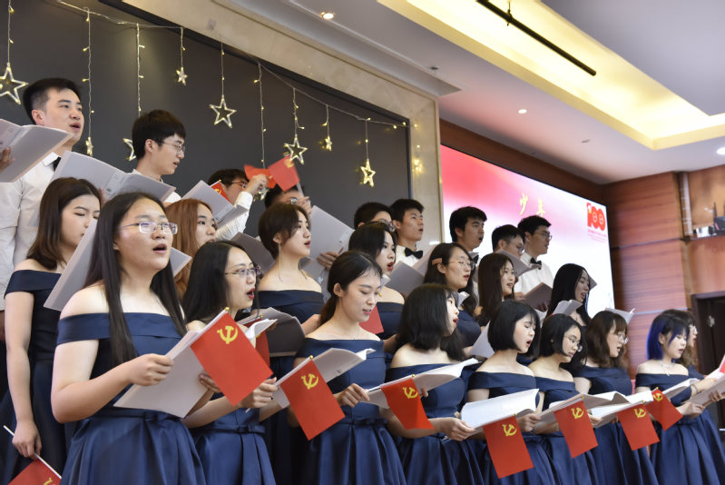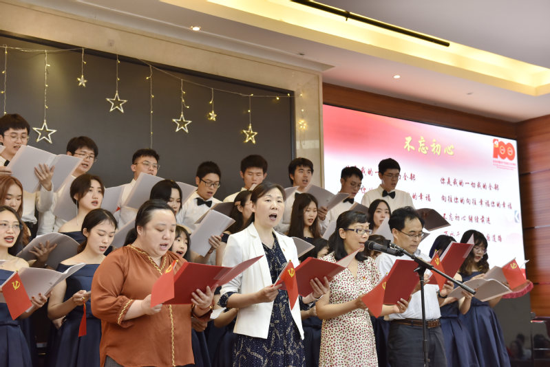 此后,公司党委委员方媛、庄瑜、李先春、刘晓陵老师上台与员工共唱《不忘初心》,现场气氛热烈,师生党员挥动手中的党旗,唱述党员初心。心院献礼特别版的《少年》也点燃全场,唱出了心院人的心声。