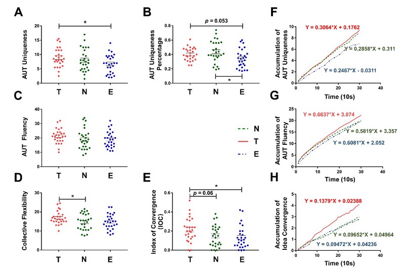 注:(A)观点稀缺性。(B) 观点稀缺性百分比。(C) 观点流畅性。(D) 集体灵活性。(E) 观点聚合指标。(F)累计观点稀缺性的时序变化。(G)累计观点流畅性的时序变化。(H)累计观点采择行为的时序变化。