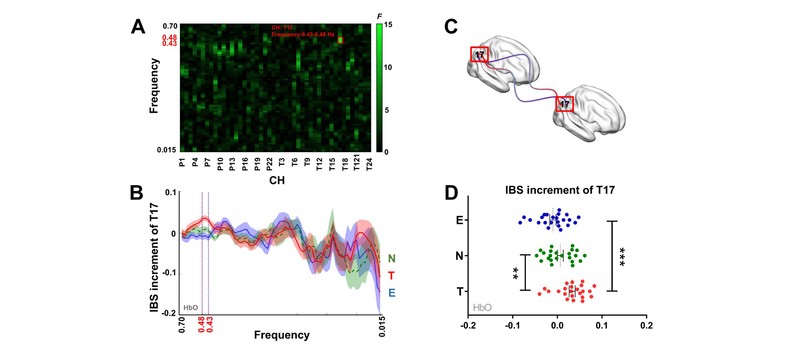 注:(A) F值热图:以交流模式为被试内变量,对0.015-0.7Hz内所有频率信号 (68个频率) 上的相同通道间 (46组通道组合) 的脑同步增量进行单因素重复测量方差分析。颜色反映了交流模式对脑同步增量的主效应的F值。在红色方块标记位置,交流模式对对应频率、通道组合上的脑同步增量的主效应显著,且通过FDR矫正。纵坐标和横坐标分别代表频率和通道。从图中可以看出,交流模式对0.43Hz和0.48Hz频率上的T17的脑同步增量的主效应显著 (FDR矫正)。 (B) 不同交流模式下,T17的脑同步增量在不同频率上的差异。 (C) T17的脑区位置,对应大脑右侧角回区域。(D) 在频段0.43-0.48Hz上,通道T17的脑同步增量。
