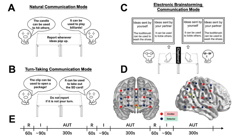一共有54位老员工 (44位女性,年龄:20.52±2.22岁) 参与本实验。被试会被随机两两配对组成27组双人小组。这些双人小组均要在上述三种交流模式下分别完成一个时长5分钟的创造力任务(非常规用途任务)。在实验过程中,实验者利用近红外光谱成像仪,同时对团体内两个成员的双侧前额叶区域和右侧颞顶区域的神经活动进行记录(见图1D, E)。