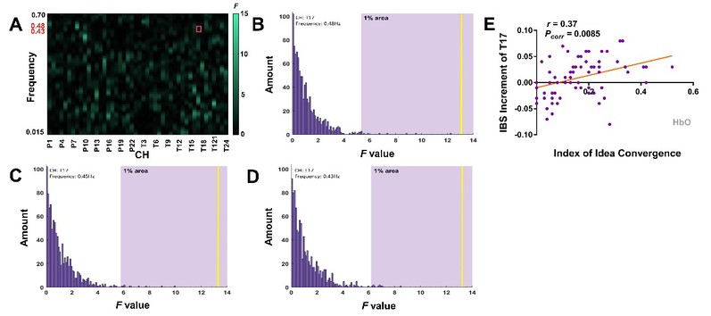 注:(A) 一次有效性检验结果的F值热图:以23组虚拟配对组为对象,以交流模式为被试内变量,对0.015-0.7Hz内所有频率信号 (68个频率) 上的相同通道间 (46组通道组合) 的脑同步增量进行单因素重复测量方差分析。颜色反映了交流模式对脑同步增量的主效应的F值。在红色方块标记位置,交流模式对对应频率、通道组合上的脑同步增量的主效应不显著。纵坐标和横坐标分别代表频率和通道。 (B) 在0.48Hz频率上,对T17的脑同步增量的1000次有效性检验的F值分布图。纵坐标代表相应F值出现的频次,横坐标代表F值大小。紫色区域代表发生概率为1%的区域。黄色线条代表本实验所发现的真实的F值。 (C) 在0.45Hz频率上,对T17的脑同步增量的1000次有效性检验的F值分布图。 (D) 在0.43Hz频率上,对T17的脑同步增量的1000次有效性检验的F值分布图。 (E) 在频段0.43-0.48Hz上,T17的脑同步增量与观点采择行为的相关图。