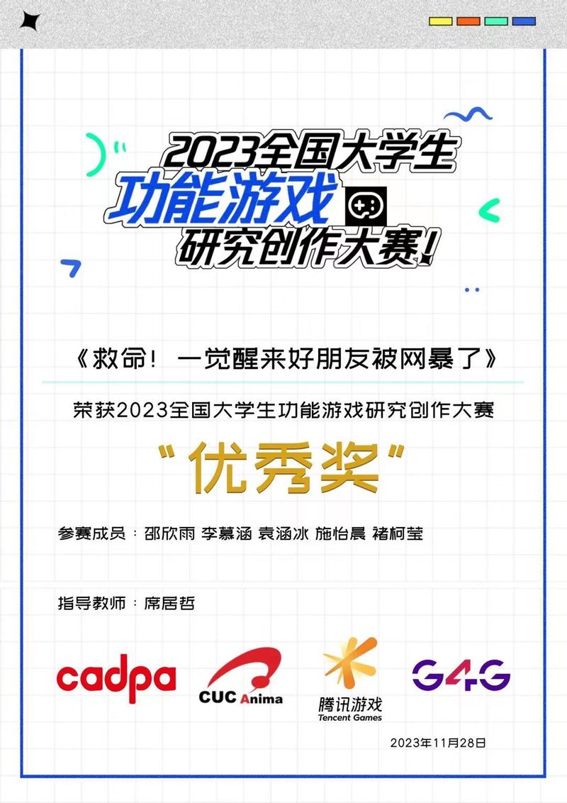 公司学子积极报名参赛。经过激烈角逐,本科生团队以青少年网络安全教育为主题创作的游戏《救命!一觉醒来好朋友被网暴了》在比赛中脱颖而出,获得优秀奖的好成绩。