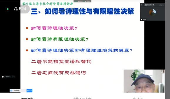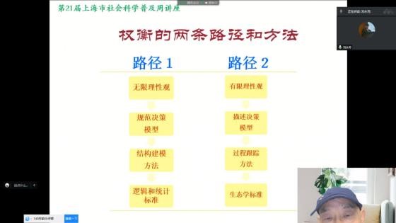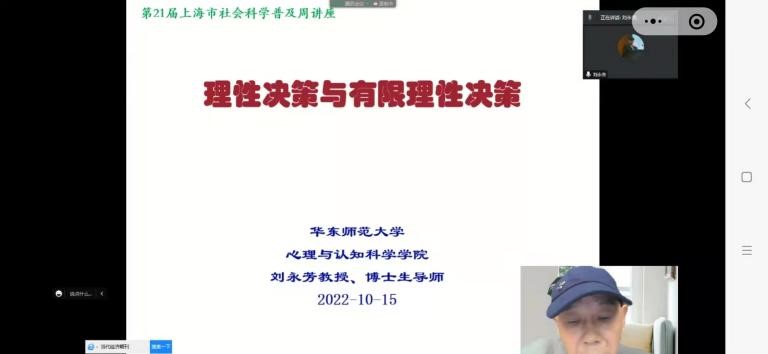 2022年10月15日,永利yl23411刘永芳教授受邀,在上海市社会科学联合会组织的“第21届上海市社会科学普及活动周”上,面向广大市民作了题为“理性决策与有限理性决策”的主题报告。本次报告通过腾讯会议和小鹅通平台同步直播,来自全国各地的700余人线上参加了报告会。