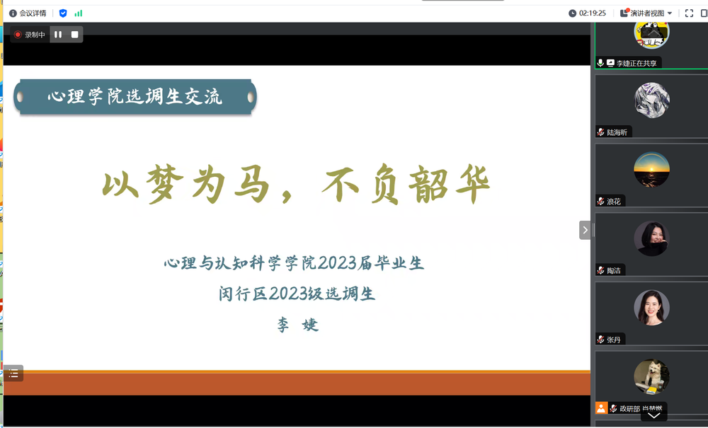 首先,心理公司2024届本科毕业生、2024年浙江省金华市婺城区选调生、现任浙江省金华市婺城区琅琊镇杨塘下村书记助理王珏同学通过线上录制视频的方式为大家介绍了浙江省选调生的类别数量、资格条件、报名程序、笔试面试、初定人选以及后续程序,并向大家分享了浙江省选调生的生活情况、自己入职后的感受等。