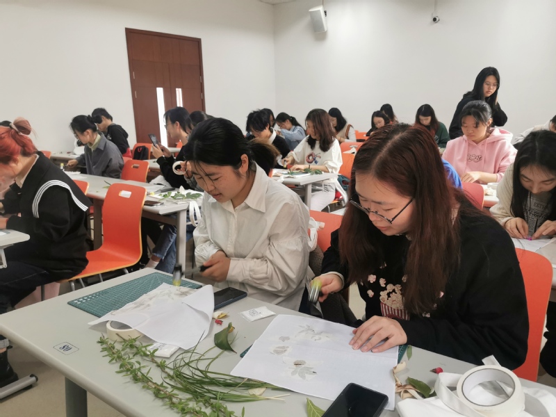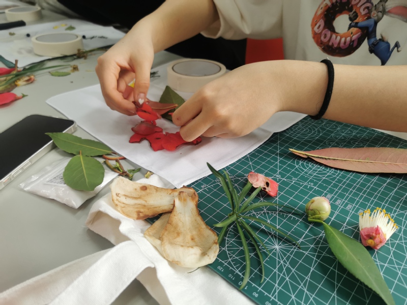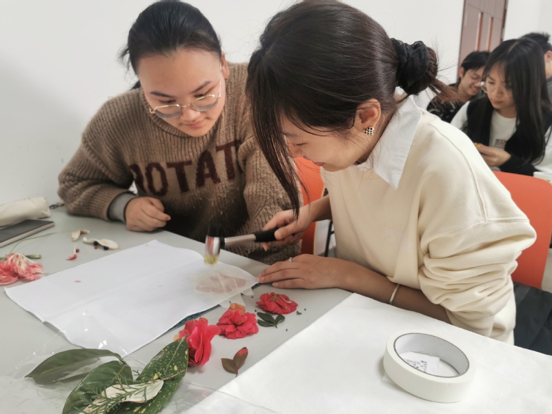 随着敲击声逐渐平息,色彩丰富的植物图案跃然纸上,大家根据自然形成的图案用颜料再进行二次创作,创造出了独一无二的拓印作品。