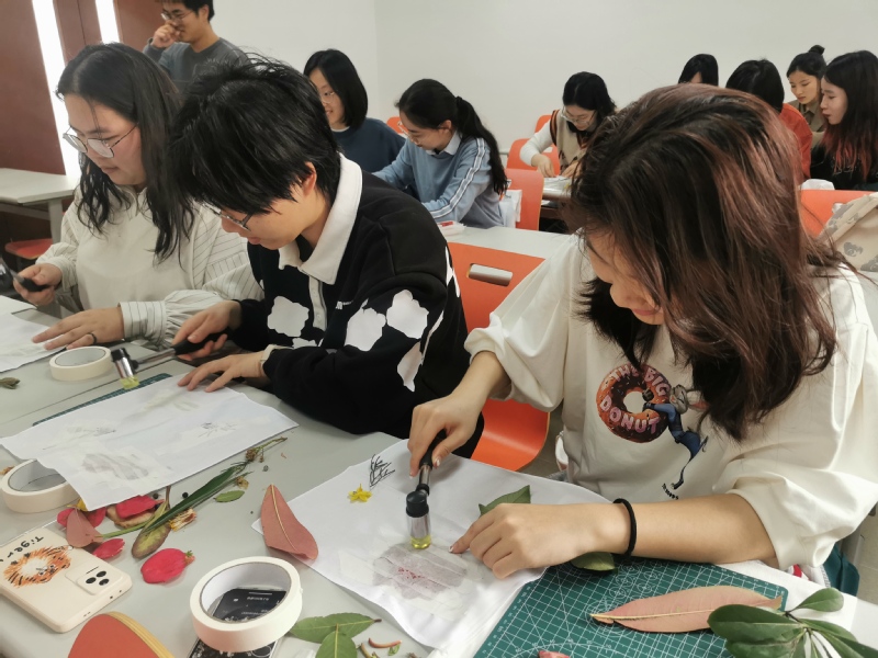 了解了校园内常见植物后,同学们便踏上拓印之旅。植物拓印是一种古老传统的印染工艺。是通过物理敲击,将新鲜植物叶片的汁水印在纸上,形成叶片图案。画面清新文艺,极具自然风,仿佛四季的颜色都留了下来。