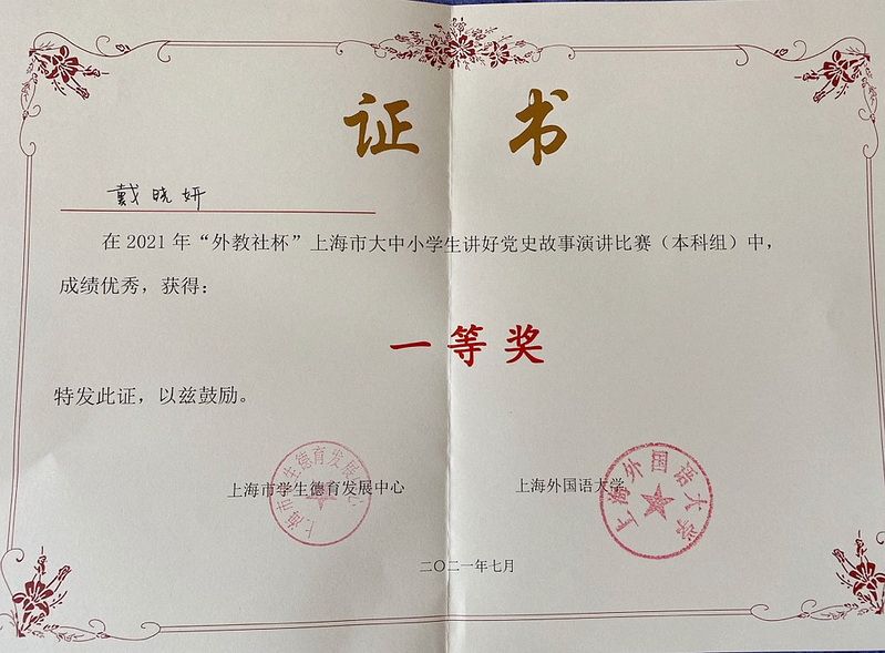 2021年7月,公司2017级本科生戴晓妍参加“外教社杯”上海市大中小员工讲好党史故事英语演讲比赛,在外语公司赵朝永老师的指导下,喜获本科组一等奖。