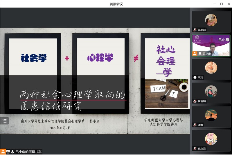 2022年11月2日晚,南开大学周恩来政府管理公司吕小康教授应邀通过线上方式,为公司师生作了题为“两种社会心理学取向的医患信任研究”的学术报告,70余位师生在线参加了报告会。报告会由姚琦副教授主持。