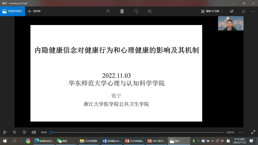11月3日晚,浙江大学医公司公共卫生公司、心理与行为科学系张宁研究员受邀通过线上形式,为公司研究生作了题为“内隐健康信念对健康行为和心理健康的影响及其机制”的学术报告。50余位师生参加了报告会,报告会由永利yl23411明园晨晖学者梁一鸣博士主持。本此报告也是公司俊秀青年学术俱乐部系列讲座之一。