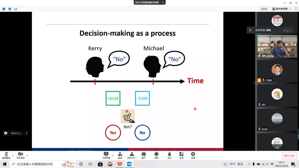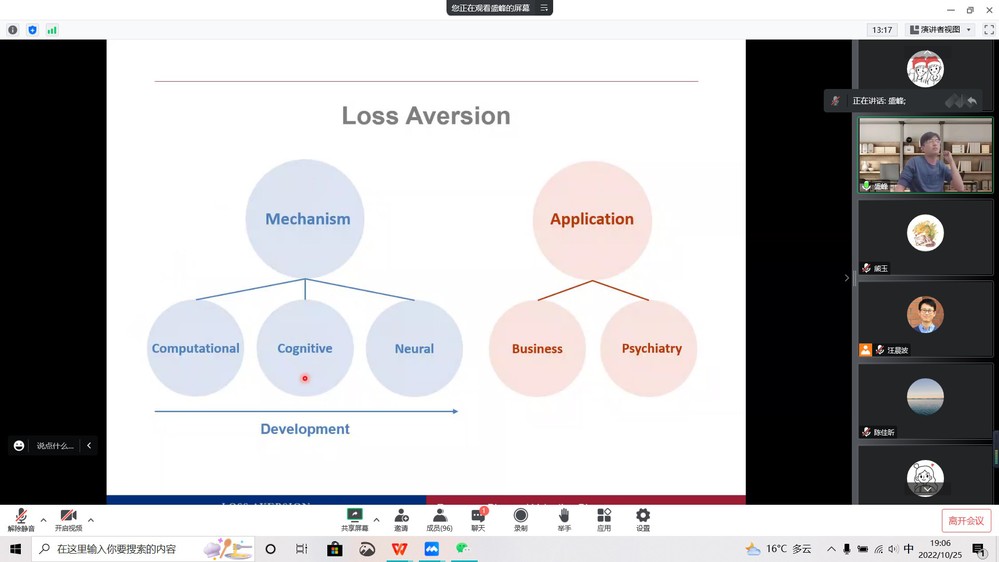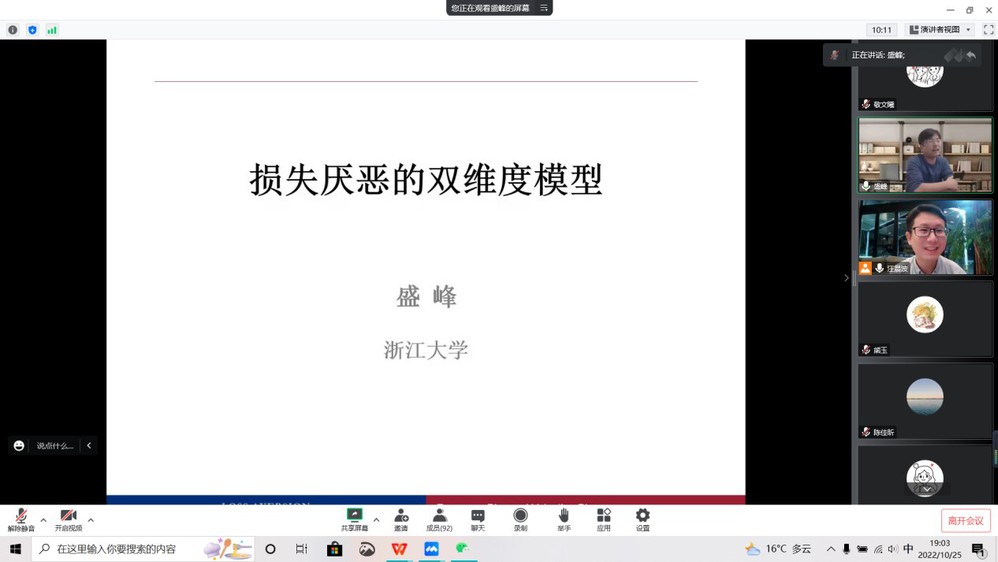 2022年10月25日,浙江大学管理公司百人计划研究员盛峰博士受邀作题为“损失厌恶的双维度模型”的学术报告。此次报告是永利yl23411俊秀青年学术俱乐部组织的系列学术讲座,也是公司社会心理与社会治理科研团队系列报告,由汪晨波副教授主持。讲座通过腾讯会议进行,共有一百余位师生参与。