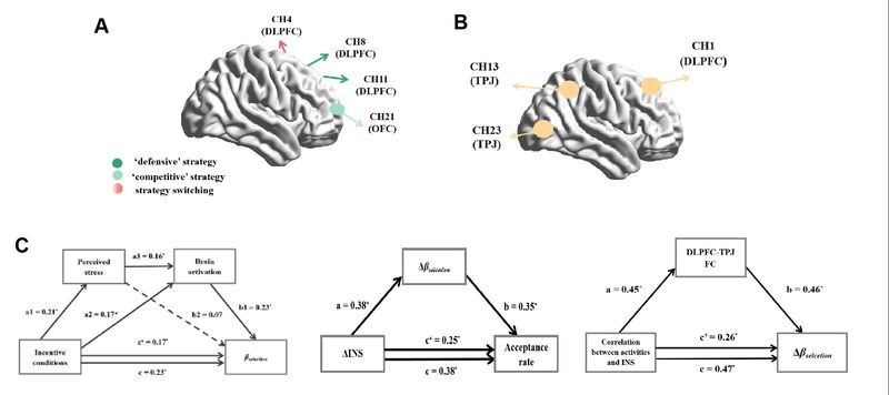 图3.神经结果。 (A)单脑上,不同建议策略的相关脑区和策略转换的特异性脑区。 (B)双脑上,影响力管理过程中人际神经同步的显著脑区。(C)中介模型表明建议信心表达策略转换和相应的影响力管理,受到建议者的DLPFC-TPJ功能连接强度的调节。
