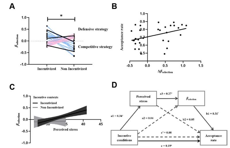图2.行为结果。 (A)总体而言,奖惩情境影响了建议者信心表达策略的转换。此外,不同奖惩情境下的策略转换存在个体差异(蓝线和粉线)。 (B)建议者策略转换程度越大,被建议者接受率越高。(C)研究结果表明,奖惩情境调节了自我报告的压力知觉对策略的影响。(D)链式中介模型表明,自我报告的知觉压力和策略建议在奖惩情境和社会影响之间起中介作用。