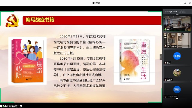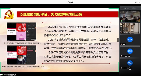 接着,方媛老师以“勇担使命、同心抗疫”为主题,向毕业生党员介绍了公司师生党员们在抗疫期间向全社会提供的疫情防控心理援助及科普工作,主要包括心理知识科普推文、心理咨询网络平台、心理咨询电话热线、心理原创手绘系列、战疫书籍等等,充分体现了心院人发挥心理专业优势服务社会的使命担当。
