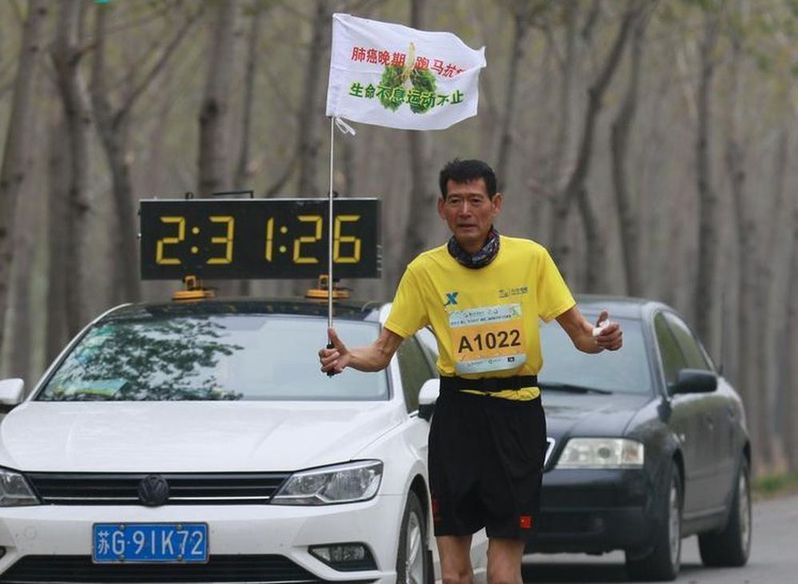 57岁的贺明,2016年被确诊肺癌晚期,医生说“只有三个月的时间”。开始“生命倒计时”的他选择散步、慢跑、爬山、锻炼,并遇到了马拉松。人生最后的四年,他参加了61场马拉松比赛,常常举着一面小旗:“肺癌晚期、跑马抗癌,生命不息、运动不止”。