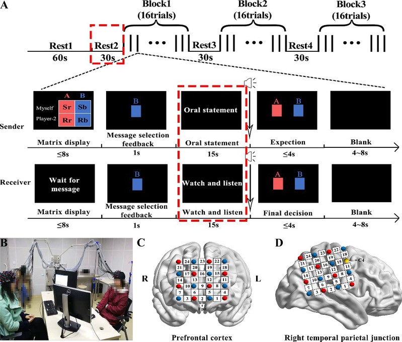 研究采用单因素(性别组合:女-女,男-男)被试间实验设计,使用发送者(说谎者)-接收者(识别者)自发说谎范式,让每对被试共同完成自发说谎任务(图1 AB)。首先向发送者呈现涉及两个人收益的分配矩阵,矩阵包含A\B两个冲突的分配方案(其中一个方案对发送者自己有利,另一个方案对接收者有利)。发送者在看到矩阵之后,需要通过按键传递信息给接收者:“A方案对你更有利” 或 “B方案对你更有利”,这一过程发送者可以发送真实信息也可以发送虚假信息。紧接着,要求发送者根据自己选择的方案进行15秒的口头描述,尽可能让对方相信自己。信息接收者在该阶段需要认真聆听或观察对方,为谎言识别收集线索。最后,信息发送者需要选择自己最终期望对方选择的选项,与此同时,信息接收者需要做出最终选择,接收者的选择决定了最后的金额分配。实验全程没有反馈。在任务期间,运用基于近红外成像的超扫描技术同时记录两被试前额叶和右侧颞顶联合区的脑活动(图1 CD)。