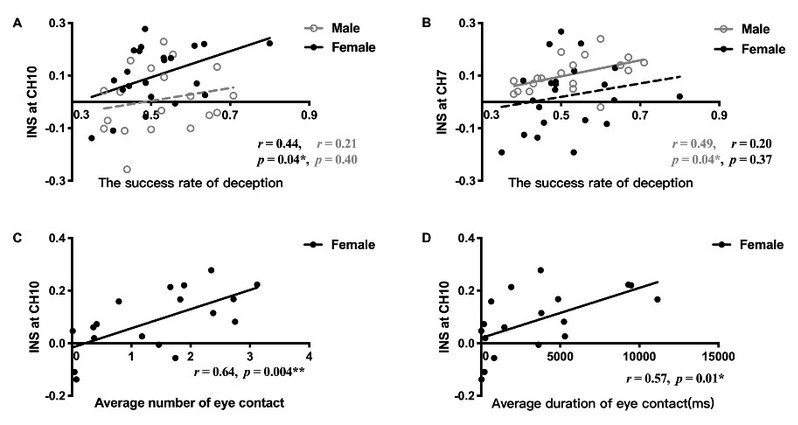 综上所述,女生欺骗互动过程依赖于眼神交流,共同的眼神交流引起前额叶脑间活动同步性的增加,从而促进成功欺骗。而男生的欺骗互动过程依赖于颞顶联合区的脑同步,这可能反映了心理理论在男生欺骗互动中的重要作用。