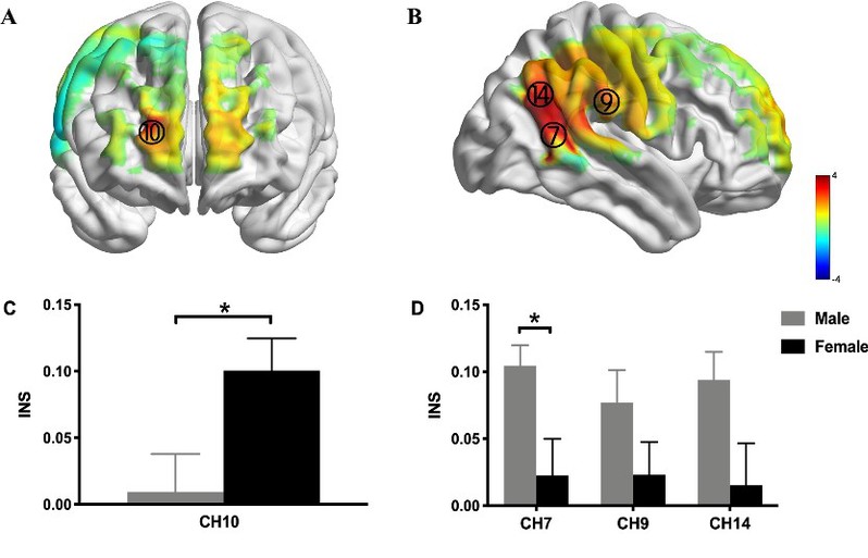 3. 脑间活动同步性结果。(A)女生前额叶通道10脑同步增加。(B)男生颞顶联合区通道7914脑同步增加;(C)男女前额叶通道10脑同步对比;(D)男女颞顶联合区通道7914的对比。