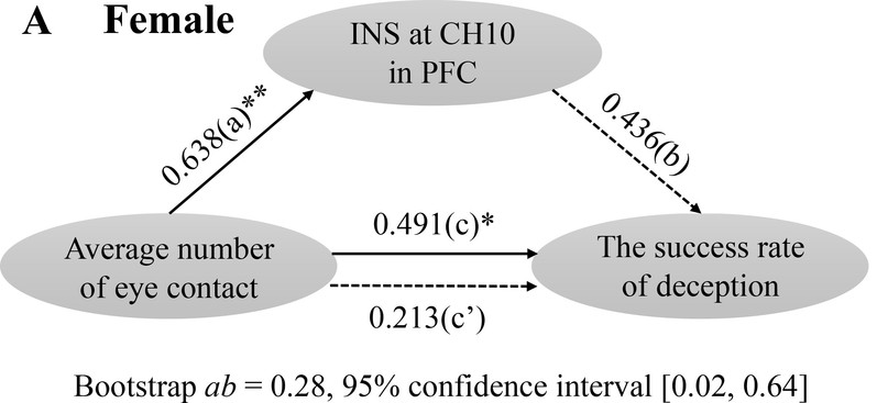 5)女生前额叶通道10的脑间活动同步性在眼神交流对成功欺骗率的影响中起到中介作用(图5)。