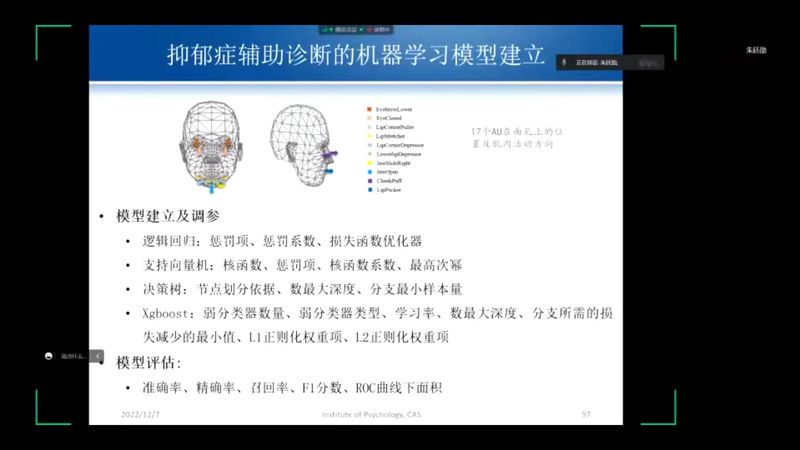 在报告中,朱廷劭研究员详细介绍了大数据及人工智能应用于心理学的基本方法,包括利用用户行为数据训练模型预测心理特征的基本思路,并以微博数据为例,详细阐述了建立自动预测模型的具体过程以及过程中的难点问题及解决,如特征提取、中文自然语言处理等。朱廷劭研究员还分享了其研究进展,包括利用行为数据预测个体心理特征的研究,如驾驶行为数据对个体大五人格的预测,基于游戏行为的风险倾向预测研究,利用微博数据研究家庭暴力对心理的影响,除了文本、特定行为数据,得益于技术的发展,个体的面部表情、步态等数据也能够用于预测个体的心理特征。研究还包括对群体心理的预测,如通过微博数据研究失独父母的行为心理变化,基于社会媒体大数据的疫情社会心态分析。除此之外,朱廷劭研究员团队还通过大数据人工智能对古文文本进行分析并将其应用于历史变迁的研究。最后,朱廷劭研究员指出,通过大数据人工智能建模的方式能够对线上自杀倾向进行识别及干预,也能提供抑郁症辅助诊断,充分体现了技术应用对现实生活的应用价值。