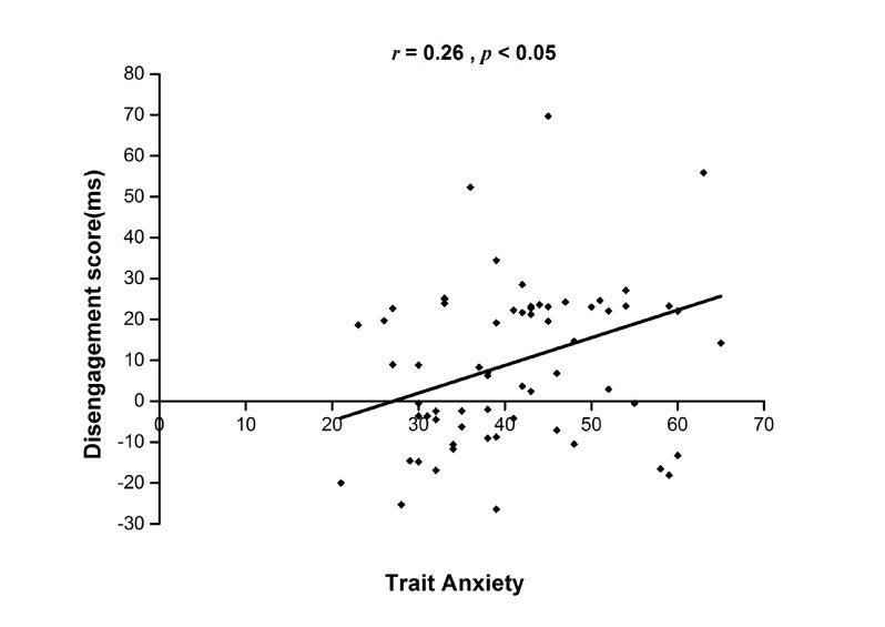研究者还计算了被试的特质焦虑的分数与注意脱离困难偏向分数的相关,发现二者有显著的正相关(见图3)。