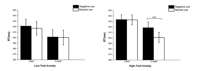 2 高、低焦虑组被试在有效和无效提示条件下,对负性提示和中性提示的反应时结果
