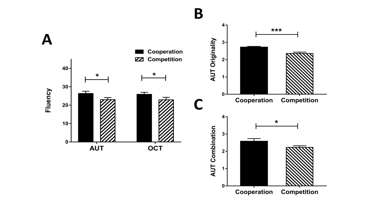 图2任务表现. (A) 不同互动模式下的AUT和OCT流畅性得分. (B) 不同互动模式下的AUT独特性得分. (C) 不同互动模式下的合作行为水平