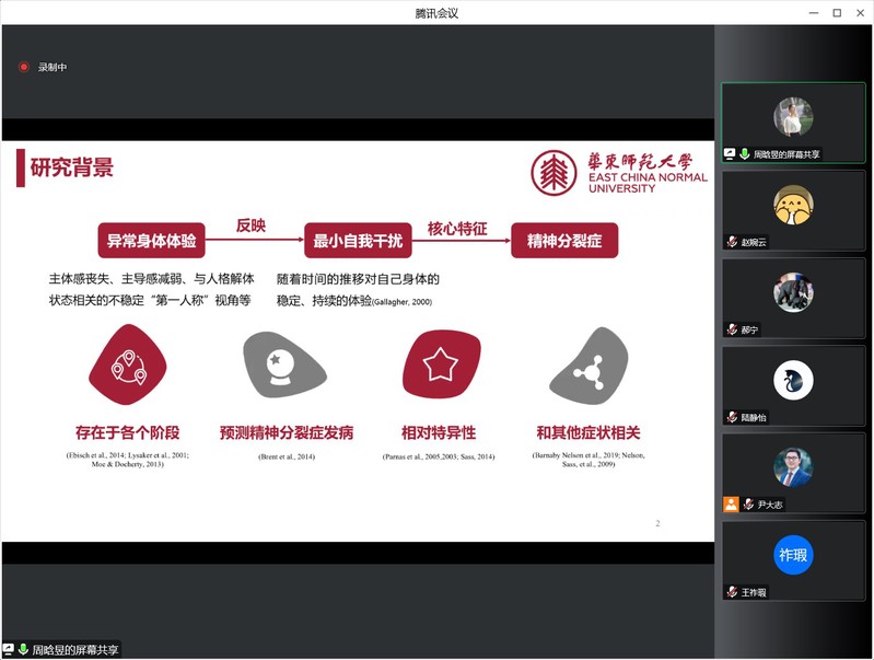 明园晨晖学者周晗昱报告了精神分裂症的核心特征之一——异常身体反应,检验了身体困扰量表(B-BODI)在中国背景下的适用性。研究提示身体自我的异常相对特异地存在于精神分裂症谱系障碍人群中。