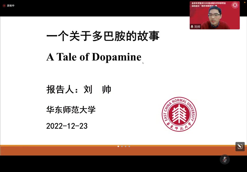 在上午的报告会中,紫江青年学者刘帅讲述了一个关于多巴胺的故事。多巴胺作为一个明星分子,拥有简单的化学分子式,但产生的结果极为复杂:它让你渴望你未曾拥有的东西,驱使你寻找新的事物。故事围绕着多巴胺的前沿进展以及刘帅老师课题组的最新发现展开。