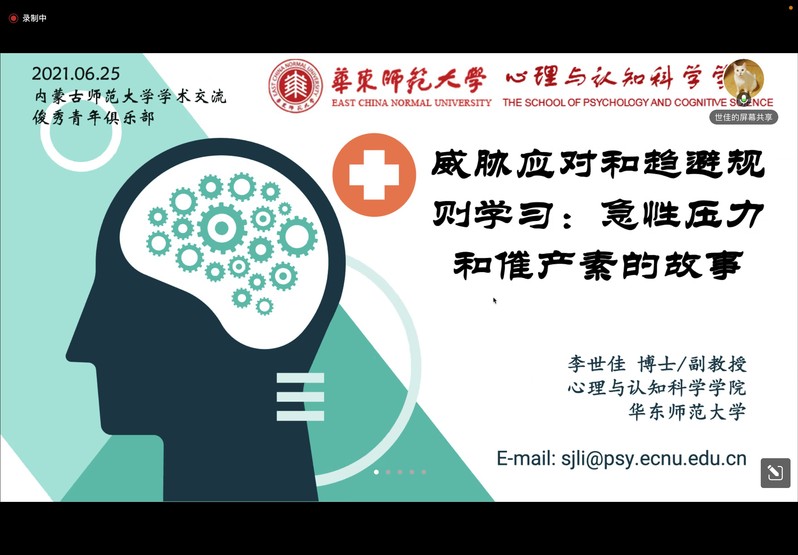 李世佳副教授报告了急性压力对认知灵活性的抑制作用——性别差异和催产素干预研究。考察了在急性社会应激的影响下,个体在趋近—回避威胁刺激的规则的反复逆转过程中,灵活学习新规则的能力是否受到负面影响,并进一步探究了催产素对这种应激相关的认知灵活性下降的干预作用。