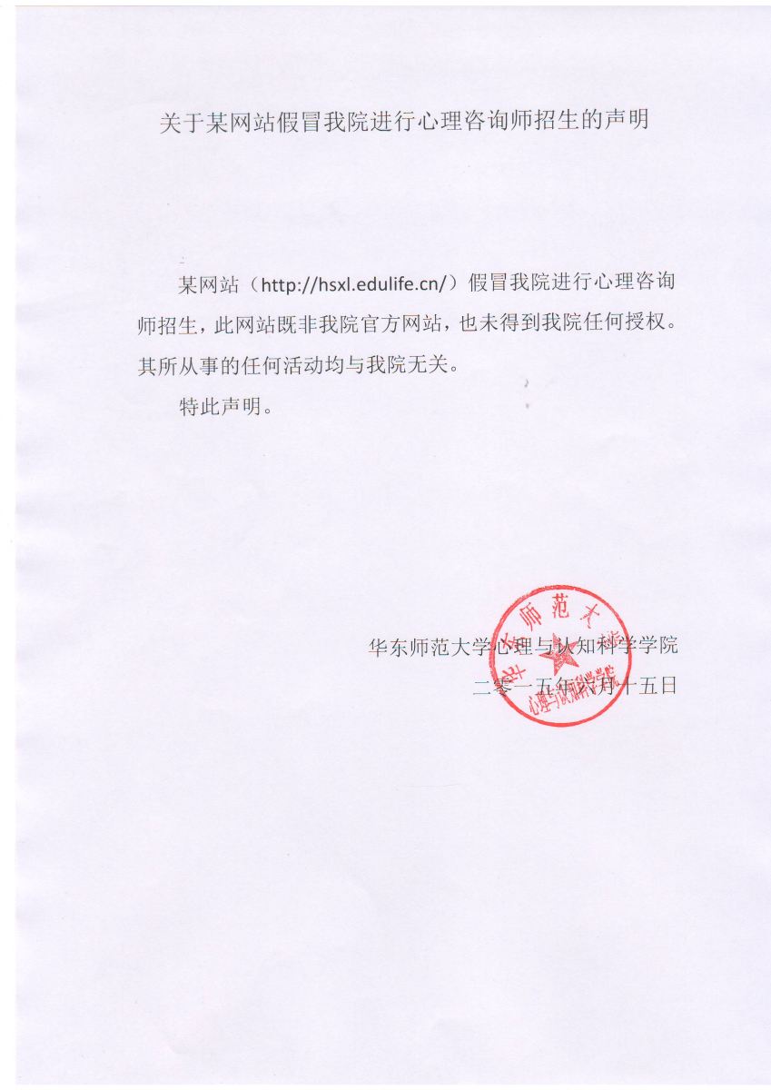 某网站(http://hsxl.edulife.cn/)假冒公司进行心理咨询师招生,此网站既非公司官方网站,也未得到公司任何授权。其所从事的任何活动均与公司无关。 特此声明。 附:某网站页面截图 永利yl23411 二零一五年六月十五日