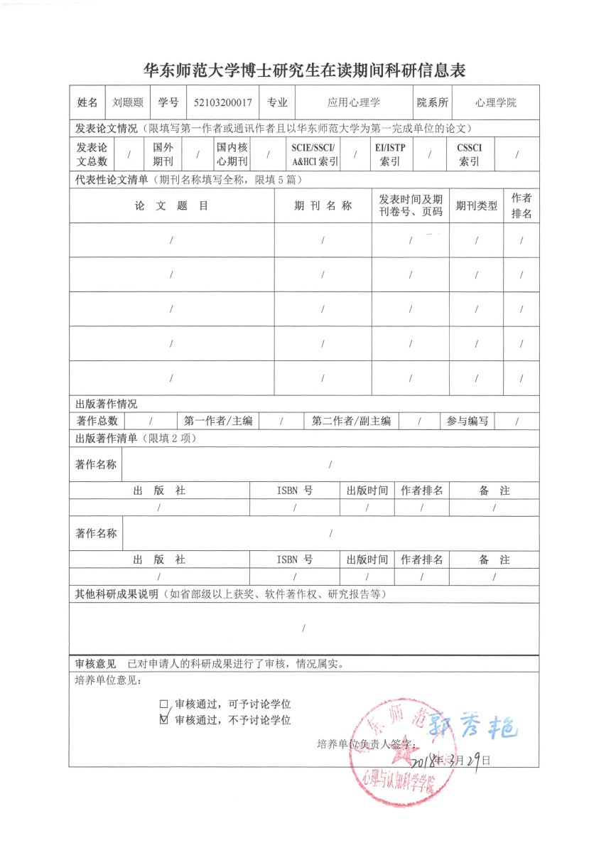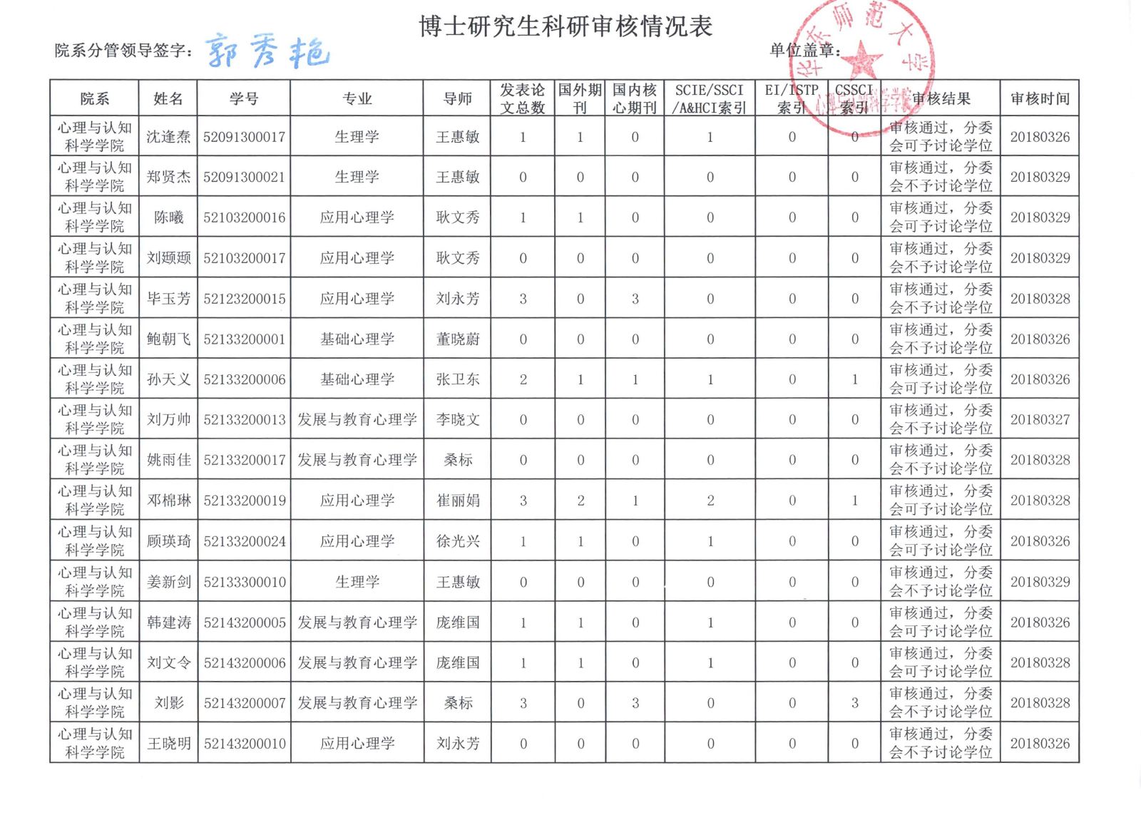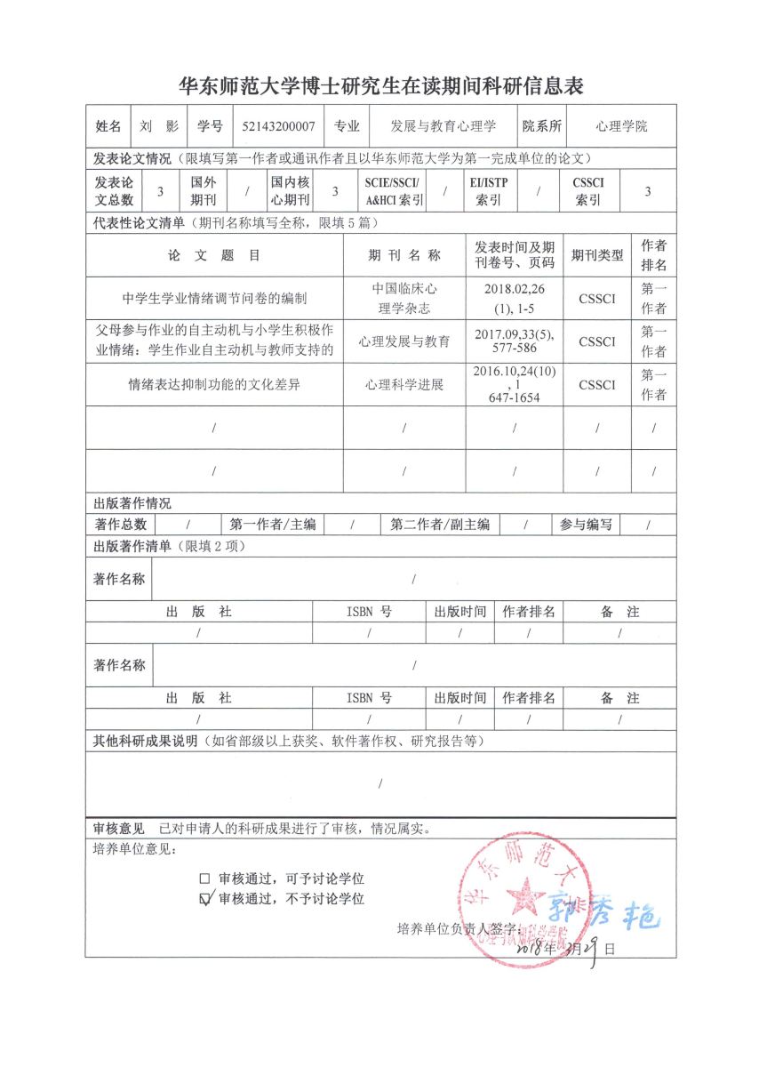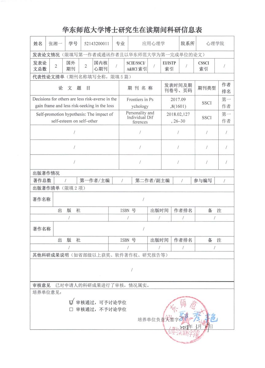 心理公司2017-2018学年第二学期博士研究生科研成果公示 (第一批) 根据《永利yl23411关于2017-2018学年第二学期博士研究生科研成果审核的通知》,现将18位博士研究生科研成果信息(见附件)予以公示,公示时间为3月30日至4月6日。公示期间如有异议,请向研究生教学办公室白老师进行反映,联系邮箱:llbai@psy.ecnu.edu.cn,办公地点:俊秀楼202室。 心理公司研究生教学办公室 2018年3月30日