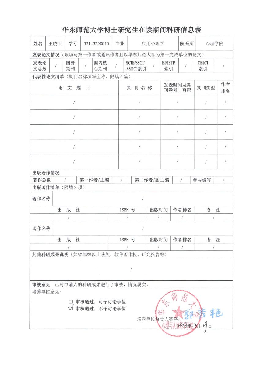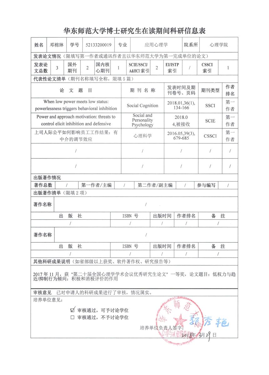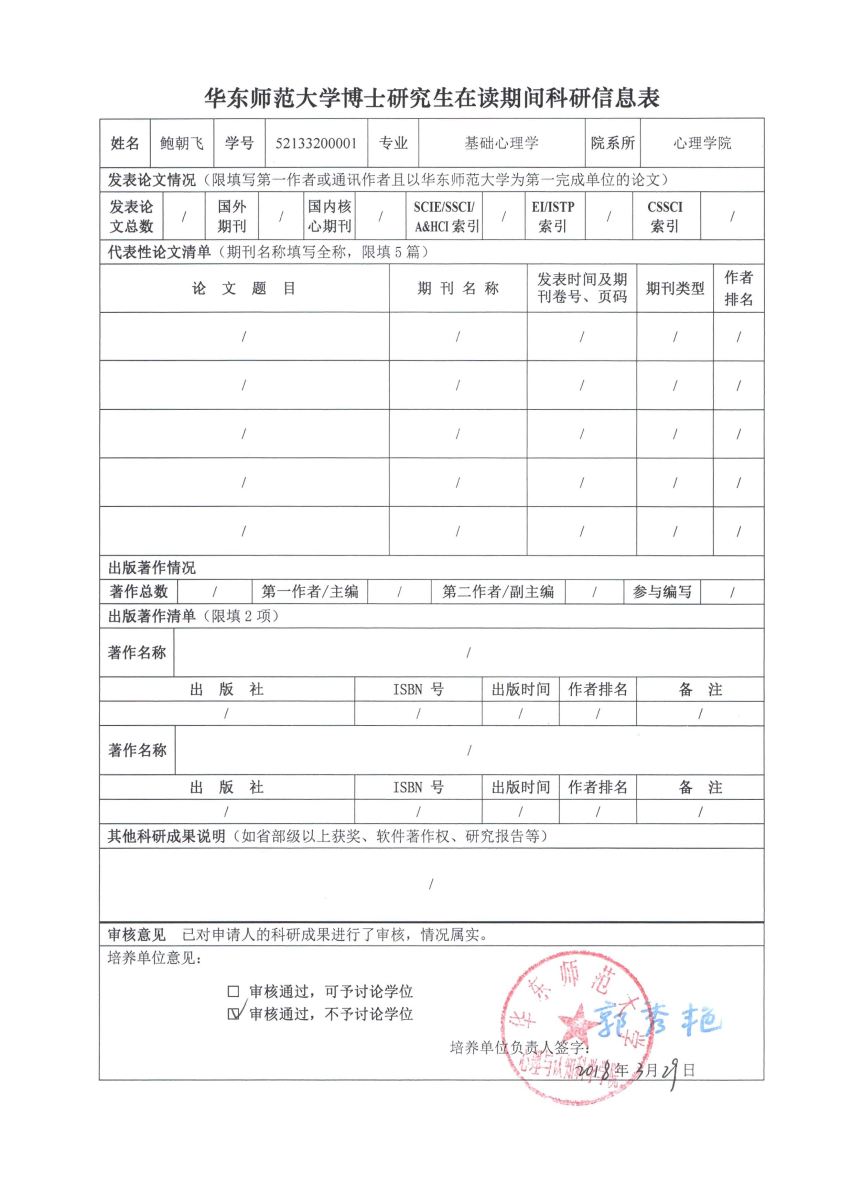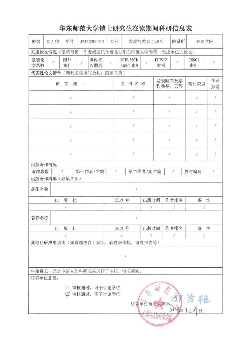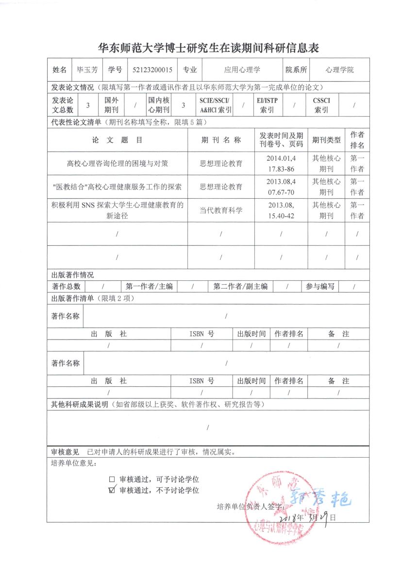 心理公司2017-2018学年第二学期博士研究生科研成果公示 (第一批) 根据《永利yl23411关于2017-2018学年第二学期博士研究生科研成果审核的通知》,现将18位博士研究生科研成果信息(见附件)予以公示,公示时间为3月30日至4月6日。公示期间如有异议,请向研究生教学办公室白老师进行反映,联系邮箱:llbai@psy.ecnu.edu.cn,办公地点:俊秀楼202室。 心理公司研究生教学办公室 2018年3月30日