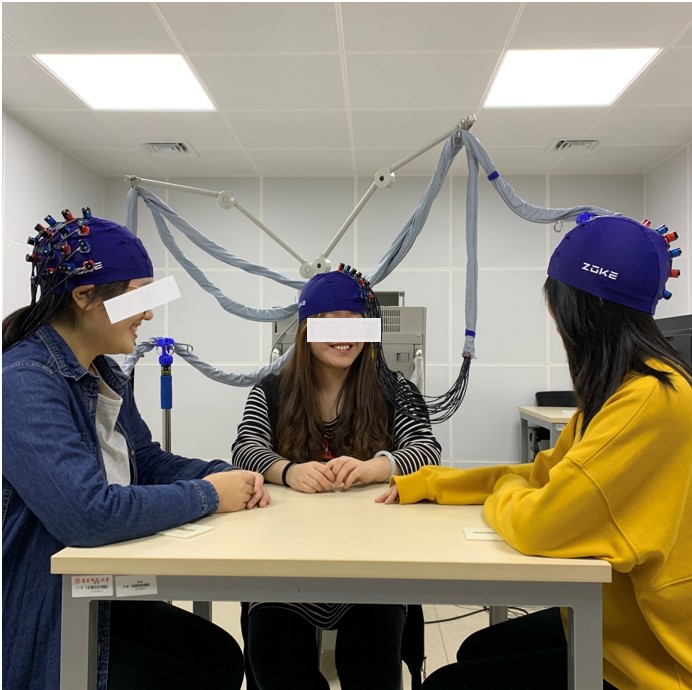 研究共招募180名被试组成60个三人小组,并随机分入指定领导者和显现领导者两种实验条件。每组被试需要完成一个团体创造性交流任务(现实情境问题任务)。在指定领导者条件下,研究者会在实验开始前随机指定一名被试作为团队领导者,领导者可以引导话题的走向。在显现领导者条件下,被试以无领导讨论的方式完成创造性任务,并在任务结束后独立评定他们心目中的团队领导者。在实验过程中,通过近红外超扫描技术同步监测三名被试的右侧颞顶区域的大脑活动(见图1)。
