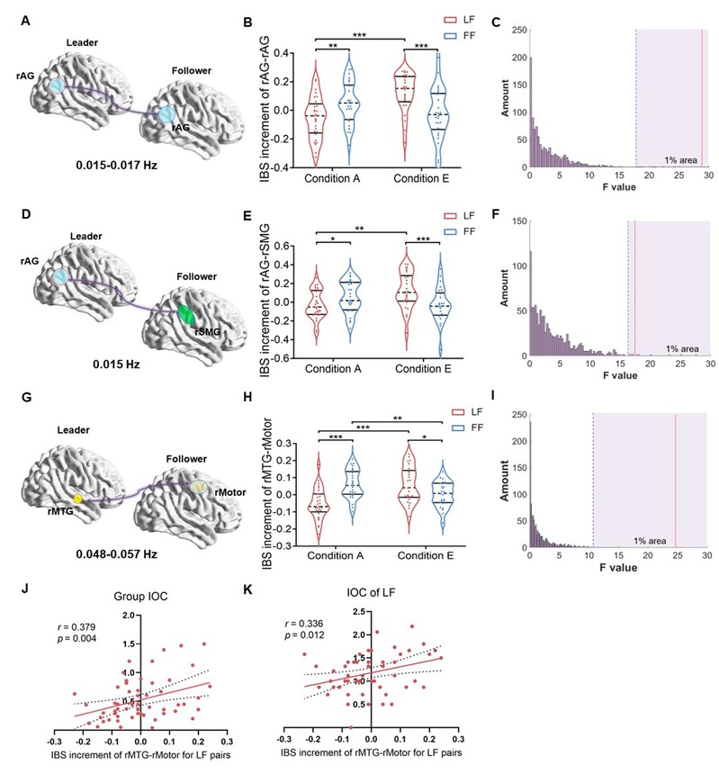 研究还发现,在显现领导者条件下,领导者-追随者在右侧角回(right angular gyrusrAG),右侧缘上回(right supramarginal gyrusrSMG),右侧颞中回(right middle temporal gyrusrMTG)与右侧运动皮层(right motor cortex)间的脑际同步性(interpersonal brain synchronization, IBS)更强,且上述IBS能有效预测领导者-追随者之间的观点采择行为。此外,图论分析表明,与指定领导者条件相比,显现领导者条件下的右侧角回和右侧缘上回两个网络节点具有更高的介数中心性。研究者认为,上述脑际神经耦合模式与领导者和追随者在团体创造性交流中的心智化、语义加工及动作想象等认知过程有关。