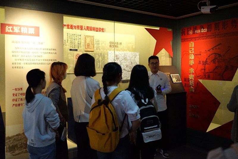 接着,同学们又来到“枪杆子与钱袋子”区域——红色票据专题展。讲解员同学从红军饭票说开来,为我们上了一堂有趣有益的情景党课。虽然经过时光的剥蚀,泛黄脆弱的纸面上的字迹依然清晰可见:“兹有红色战士在群众家吃饭壹餐,特给此票为证”。这一张小巧但珍贵的红军饭票见证了80多年前中国共产党艰苦奋斗的岁月,印证了我军在艰难处境中,仍然恪守铁的纪律。
