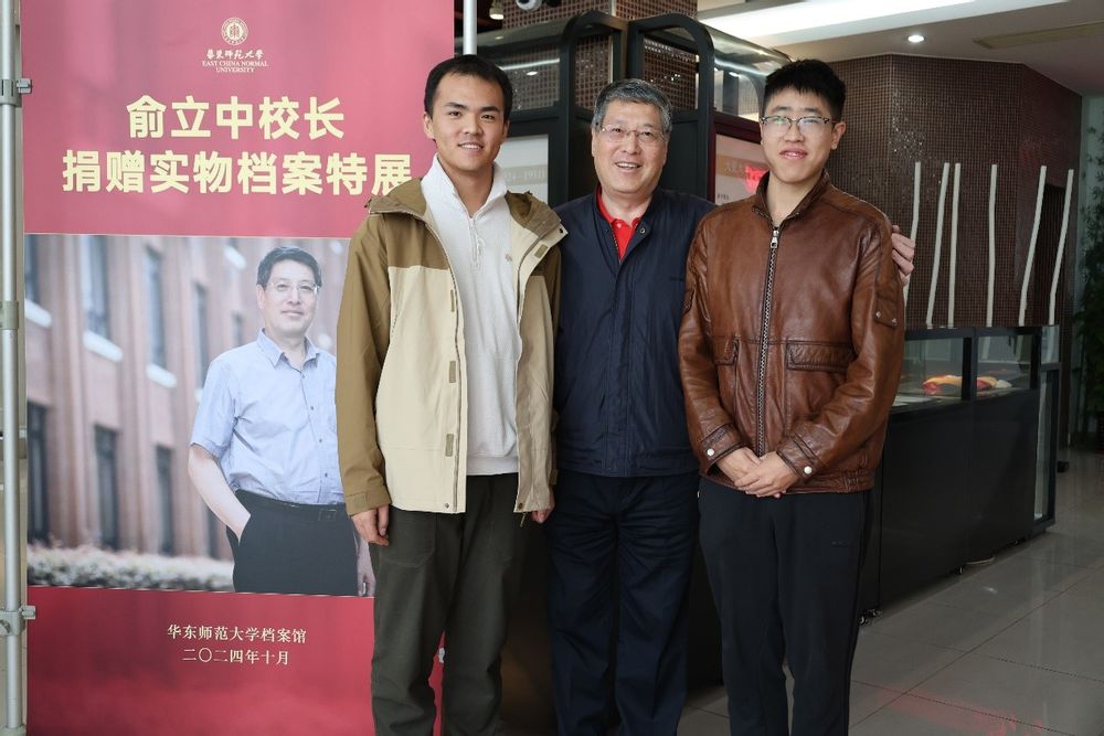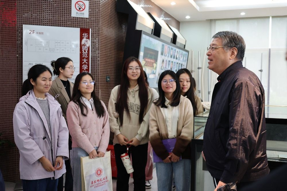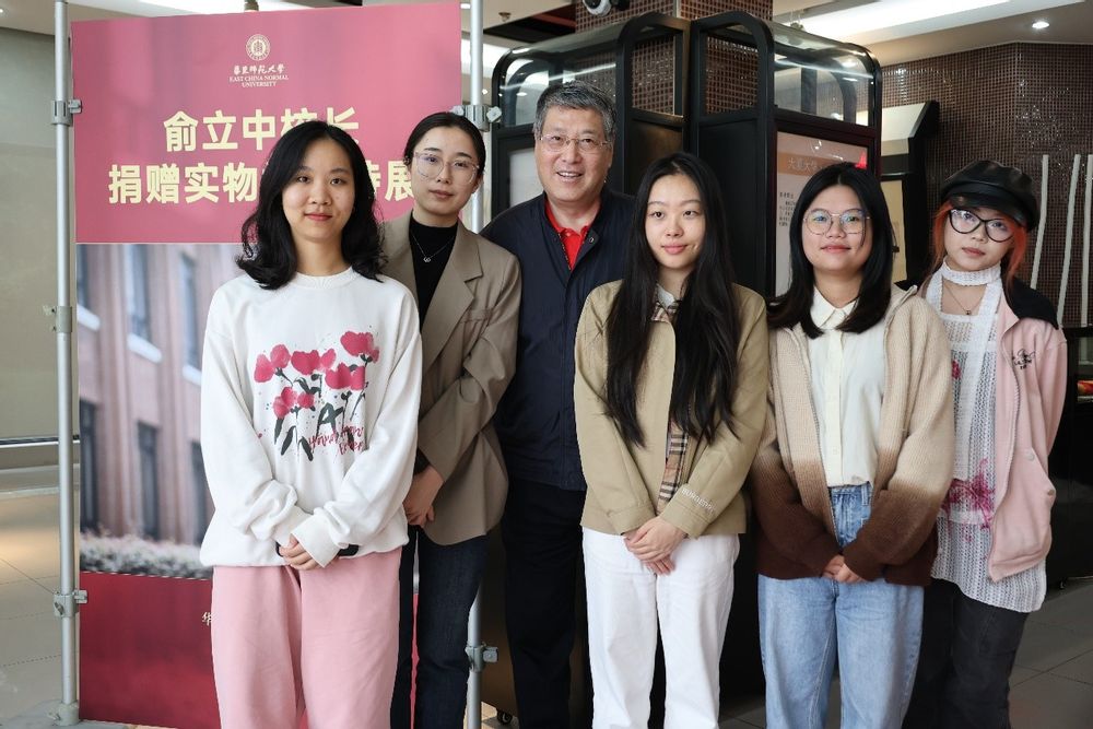 捐赠仪式后,同学们来到档案馆一楼展厅,参观俞董事长捐赠实物档案特展。俞董事长和同学们亲切交流,合影留念。他表示,无论是过去还是现在,他都希望能与同学们保持紧密联系,“坐一张板凳、吃一桌饭菜”,了解同学们的生活与学习情况,与同学们分享自己与华东师大的美好故事。