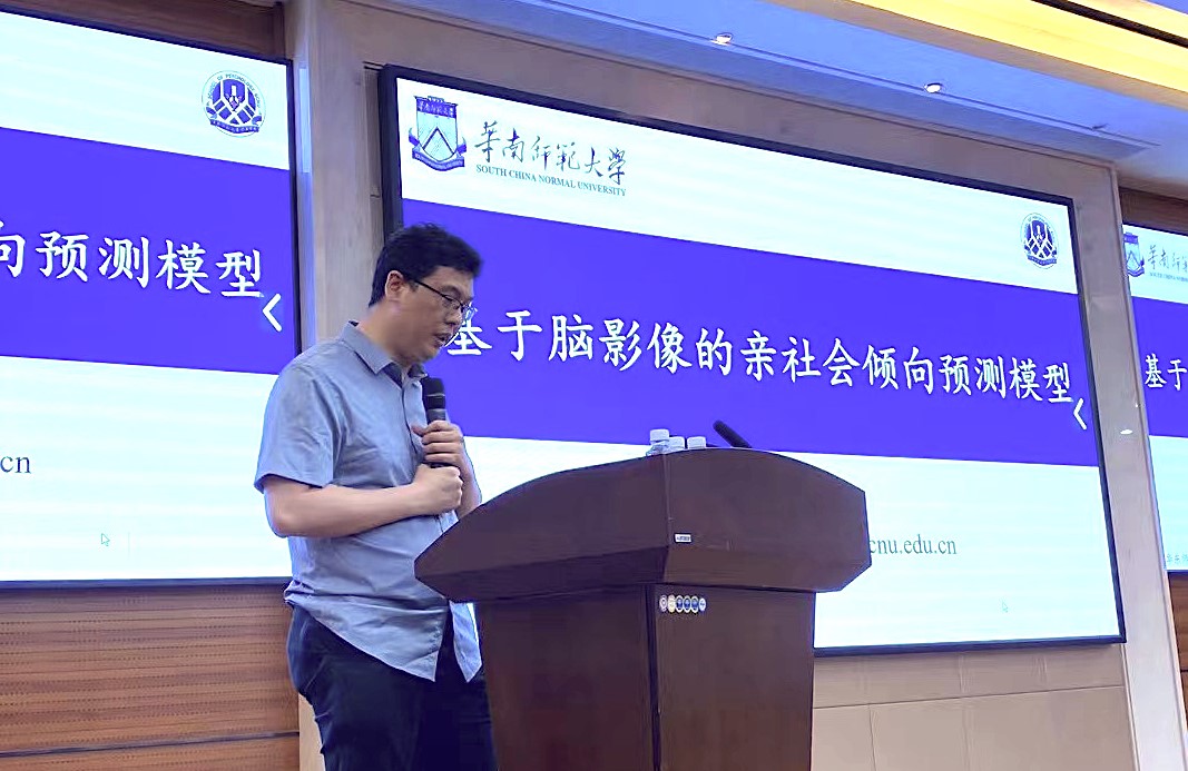 2023年5月26日下午,华南师范大学心理公司封春亮副教授应邀来到公司,在俊秀楼223报告厅作题为“基于脑影像的亲社会倾向预测模型”的学术报告。副经理郝宁教授、相关领域青年教师、研究生和本科生等40余人参加了本次报告会。报告会由公司胡杨副教授主持。