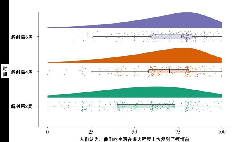 研究者也发现,在解封后,人们并不认为“解封“那一刻就代表着生活恢复正常,而是随着时间的推移,人们逐渐回到了原本的生活。在解封后的第二个月末(2020年6月),当参与者被问及他们的生活在多大程度上已经恢复正常时,人们认为那时的生活已经恢复到了疫情前生活的75%左右(图2)。