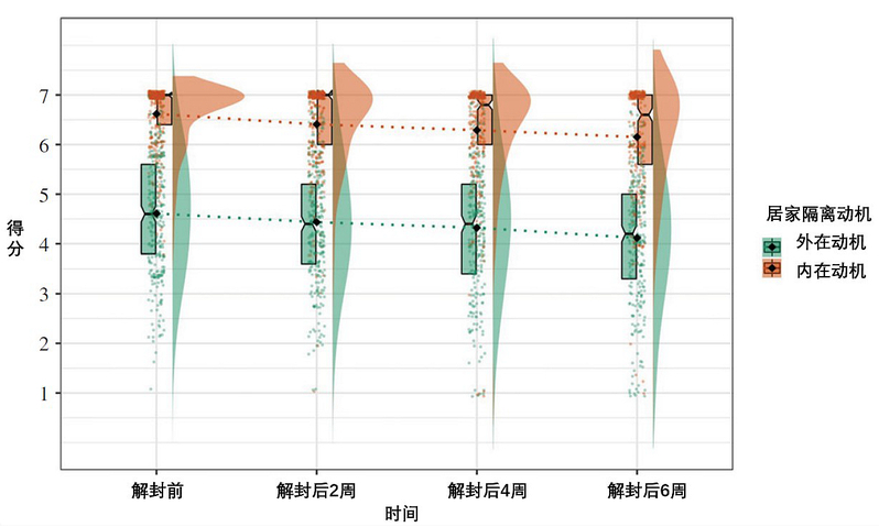 研究结果于2020年9月发表在Royal Society Open Science上 (可点击此处阅读全文)。该研究发现,解封后,人们的心理健康水平正缓慢的改善,其中一些发现和研究的预期相一致。例如,在解封后,人们仍保持较高的居家隔离动机,但这种高动机更多的是来源于对居家隔离能够保护身体健康的认同,而非由于外界的要求(图1)。