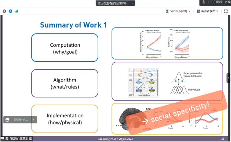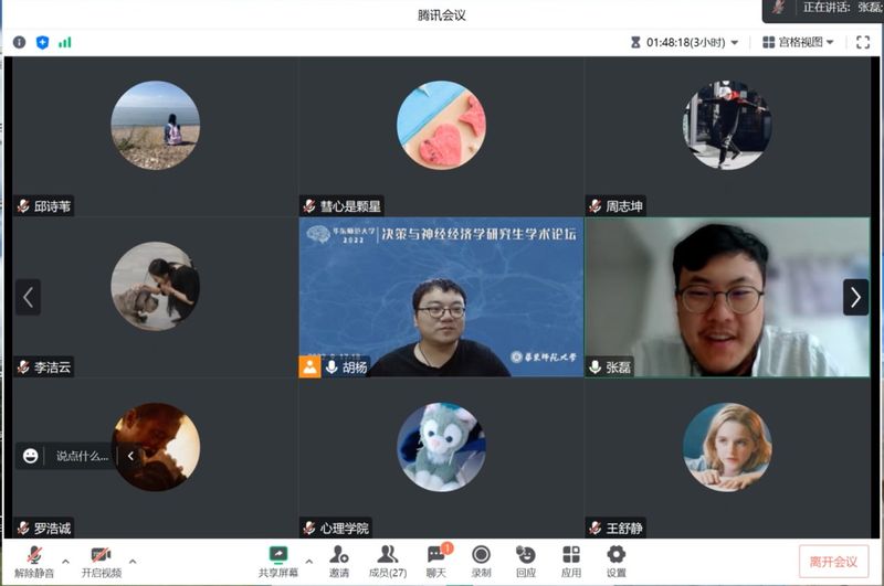 最后,张磊副教授和与会师生们针对本次报告的研究内容、建模方法和科研学习经历展开热烈讨论和交流。本次线上报告会拓展了师生们对该类研究问题的认识和研究思路,为我们理解、研究社会学习行为的神经计算机制提供了理论指导和技术方向。