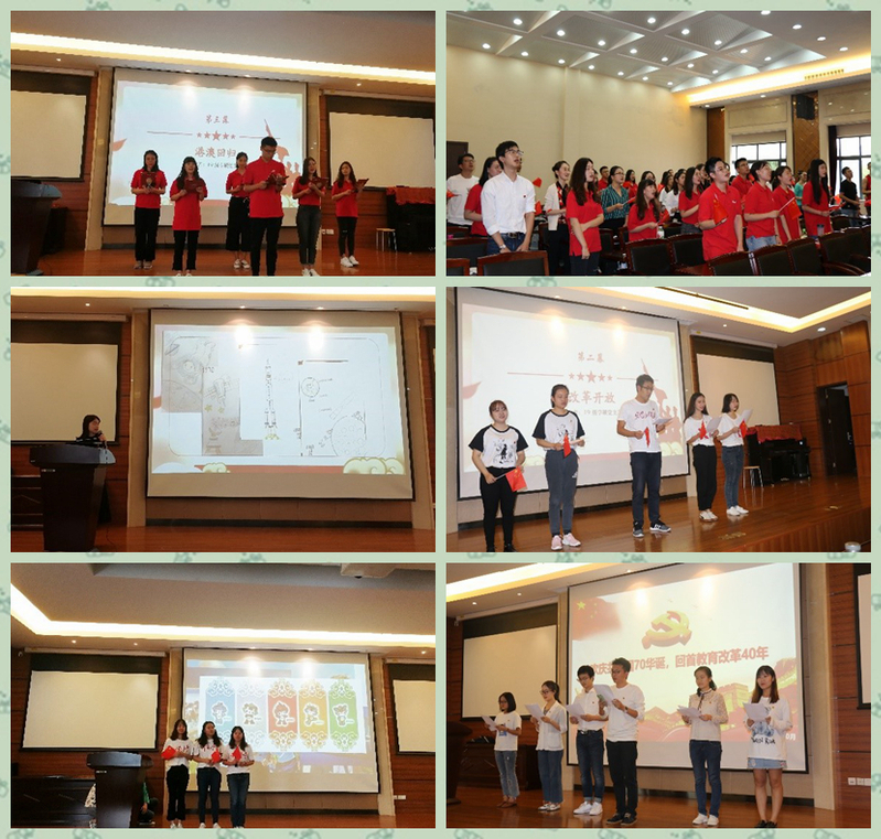 10月13日下午,永利yl234112019级学硕、2019级专硕、本科生党支部围绕“我和我的祖国”主题联合开展《七十载风雨铸辉煌,新时代砥砺再前行》主题党日活动。员工党员们以新中国成立70年为时间轴,通过情景剧表演、故事分享、绘画、朗诵、咏唱等多种形式来展示新中国70年的光辉历程和伟大成就,致敬伟大祖国。